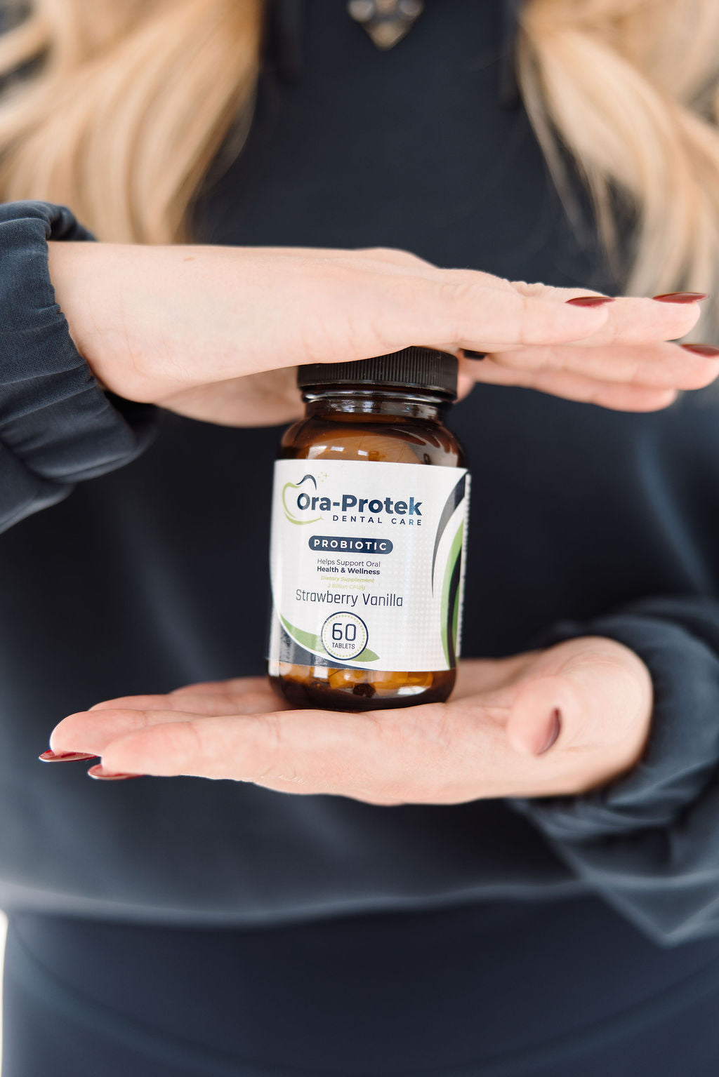 Ora-Protek is a dentist-formulated oral probiotic that complements your regular brushing and rinsing routine. It’s designed to support a healthy balance of bacteria in the mouth—your oral microbiome.